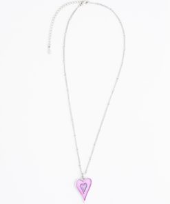 This is a beautifully delicate but eye catching contemporary pink heart necklace. A small purple heart appears to be floating in the middle of a slightly larger raspberry heart. The two colours working together in perfect harmony.